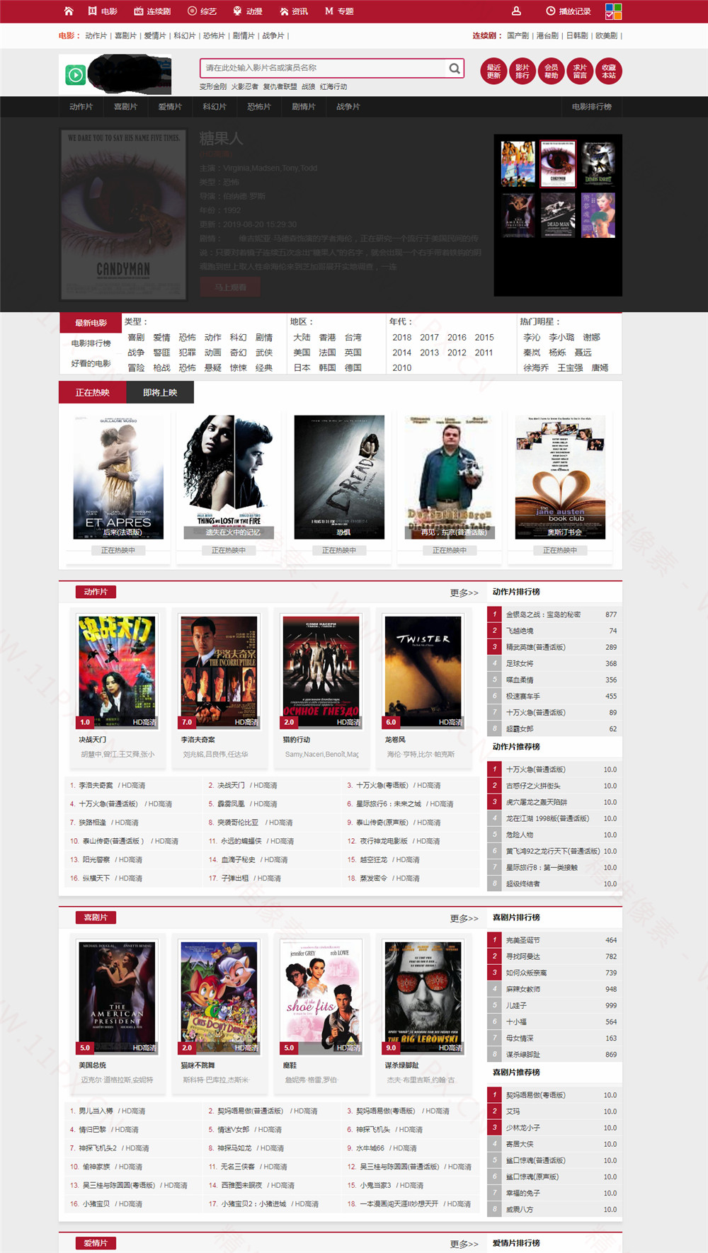 红色yy苹果CMS模板,本苹果CMS模板为v10版本,网站模板为UTF-8编码。网站模板首页需要小改一下调用方法,网站模板分为首页、电影列表、电影内容页、电影播放页、新闻列表页、新闻内容页。