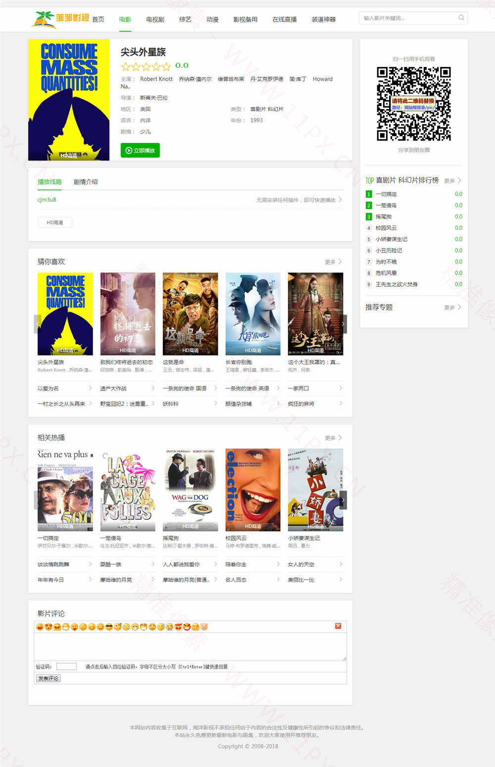 网站模板包含首页、列表页、内容页、播放页 搜索页。基于海洋CMS开发,utf编码,模板测试完美无错,采集直接使用。